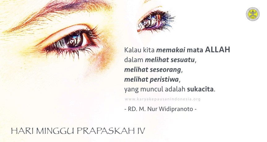 A similar story is also told in today’s Gospel. People just look at the appearance. The disciples of Jesus did the same when they saw a blind man from birth, “Rabbi, who sinned, this man or his parents, that he was born blind?” His neighbors also judged this blind man, “Isn’t this the one who used to sit and beg?” The Pharisees also judged Jesus from their eyes, “This man is not from God, because he does not keep the Sabbath.” The Pharisees also intimidated the man who had been blind by saying, “Give God the praise! We know that this man is a sinner.” They answered to him, “You were born totally in sin, and are you trying to teach us?”