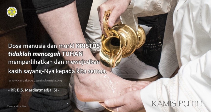 Dalam kerangka itu, Yoh. 13:1-15 pantas direnungkan sepanjang hari, khususnya apabila kita merenungkan dengan Jam Kudus. Dosa manusia dan murid Kristus tidaklah mencegah Tuhan memperlihatkan dan mewujudkan kasih sayang-Nya kepada kita semua. Betapa berharganya seluruh Perayaan Kamis Putih untuk membarui iman akan Kasih Sayang Tuhan Yesus kepada kita semua. “Tuhan, kami bersyukur atas Kasih Sayang-Mu. Kami mohon agar Roh Kasih Kau limpahkan supaya kami menyambut Ekaristi dengan sepenuh hati kami: sebab kami ingin menyambut Cinta-Mu”.