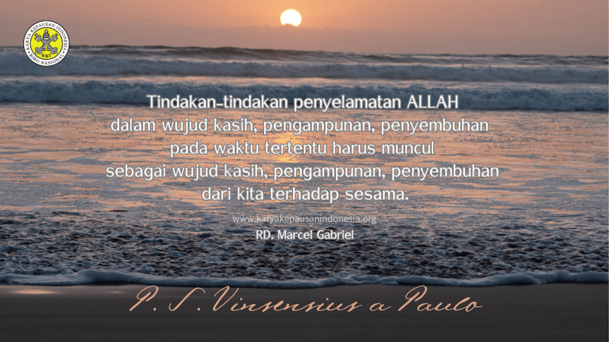Dan seperti halnya dengan para murid Yesus itu, demikianlah juga saudara dan saya. Tugas-perutusan para murid yang dilengkapi dengan aneka kuasa itu, sekarang ini diwariskan kepada Gereja di mana saudara dan saya adalah anggotanya. Karena itu, tindakan-tindakan penyelamatan Allah dalam wujud kasih, pengampunan, penyembuhan tersebut pada waktu tertentu harus muncul sebagai wujud kasih, pengampunan, penyembuhan dari kita terhadap sesama, sebagaimana yang kita doakan dalam doa Bapa Kami itu, “Ampunilah kami, seperti kamipun mengampuni orang yang bersalah kepada kami” (Matius 6:12). Demikianlah adanya bahwa Allah adalah Sumber kasih dan keselamatan, dan perwujudan kasih dan keselamatan itu mengikutsertakan banyak nabi, imam dan raja, para hakim dan para rasul, dan bahkan semua pengikut dan murid Yesus termasuk saudara dan saya. Karena itu: mari kita menjadi pelaku kasih dan keselamatan Allah itu, supaya pada gilirannya kita pun dapat menjadi penyalur kasih dan keselamatan Allah kepada sesama kita, sebagaimana yang dilakukan oleh orang kudus kita hari ini: Santo Vincentius a Paulo, yang setelah ditahbiskan menjadi imam pada tahun 1600, memberikan seluruh hidupnya untuk melaksanakan karya-karya belas kasih dengan perhatian khusus kepada para penderita dan orang-orang dalam penjara. Vincentius bahkan mendirikan kongregasi para imam dan suster untuk dengan karya pelayanan khusus pada bidang karitatif ini bersama Pierre de Berulle dan Louise de Marillac. Santo Vincentius a Paulo doakanlah kami. Amin!