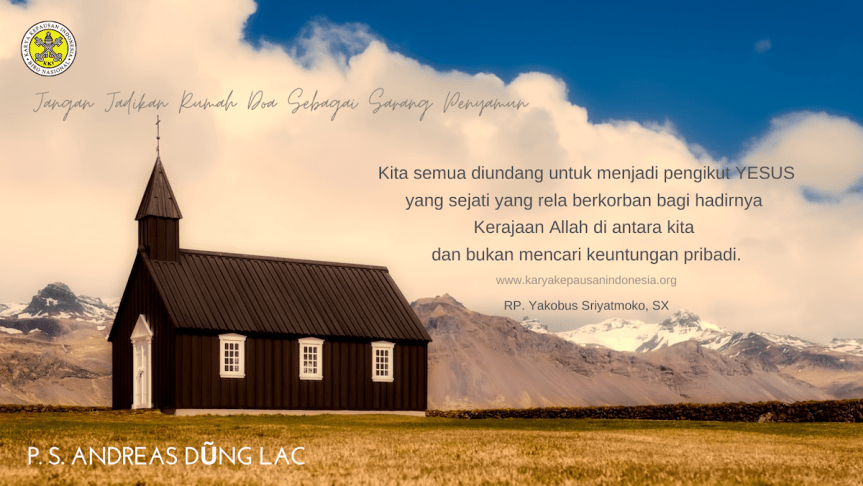 Bacaan Injil pada hari ini menampilkan kisah Yesus mengusir para pedagang yang ada di bait Allah sambil berkata, “Ada tertulis: Rumahku adalah rumah doa. Tetapi kalian telah menjadikannya sarang penyamun.” Para pedagang itu menyalahgunakan bait Allah menjadi tempat untuk jual-beli binatang kurban. Para pedagang binatang kurban kongkalikong dengan Dewan Pemeriksa Hewan Kurban untuk mendapatkan keuntungan sebesar-besarnya dengan cara yang tidak jujur. Ada juga di antara para pedagang itu para penukar uang yang mencari keuntungan dari para peziarah yang datang dari pelbagai negara dengan membawa mata uang masing-masing. Bait Allah yang semestinya menjadi rumah doa berubah menjadi sarang penyamun karena di situ banyak praktik perdagangan tidak jujur!