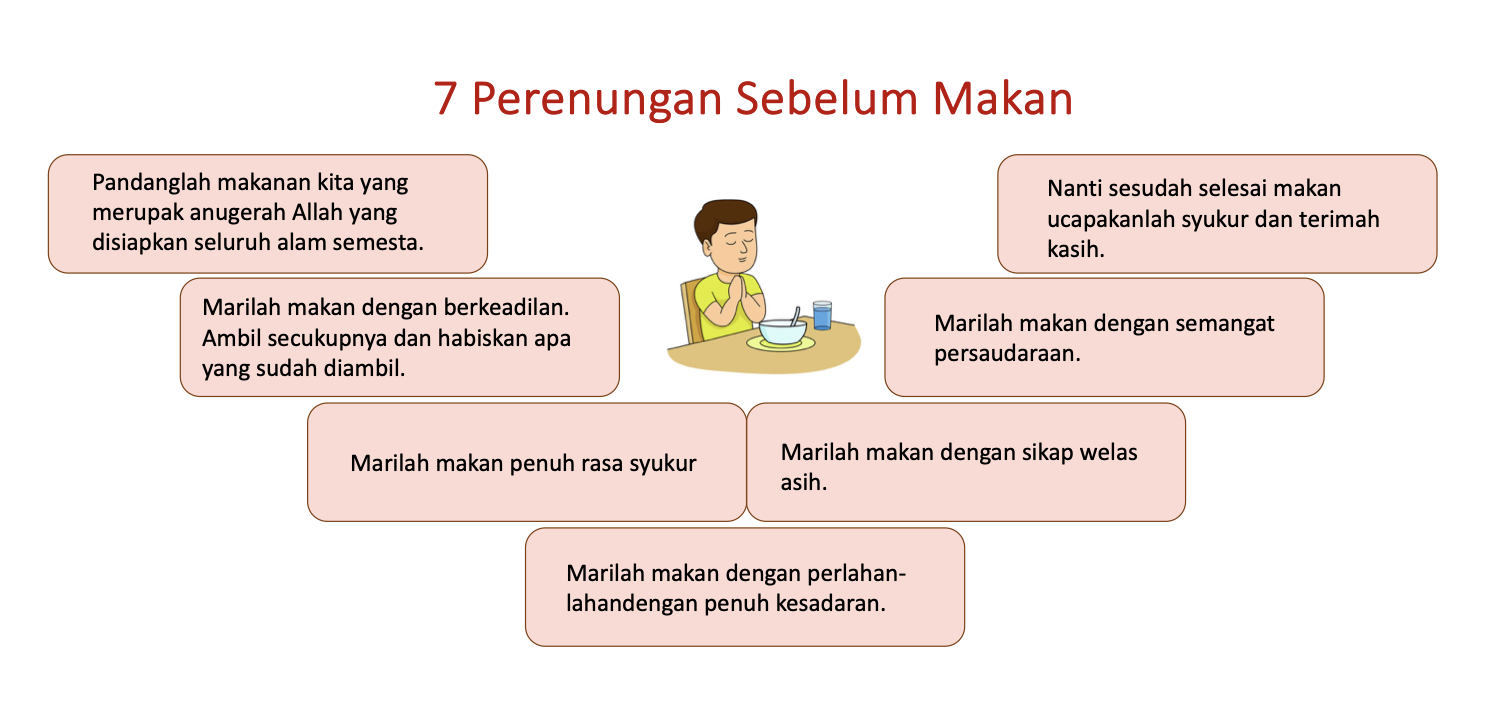Sebelum makan pagi Kakak Nicken dari Keuskupan Pangkalpinang meminta seorang remaja dari Keuskupan Padang membacakan 7 perenungan sebelum makan. Para peserta T-SoM diminta untuk melakukan perenungan ini sebelum makan.