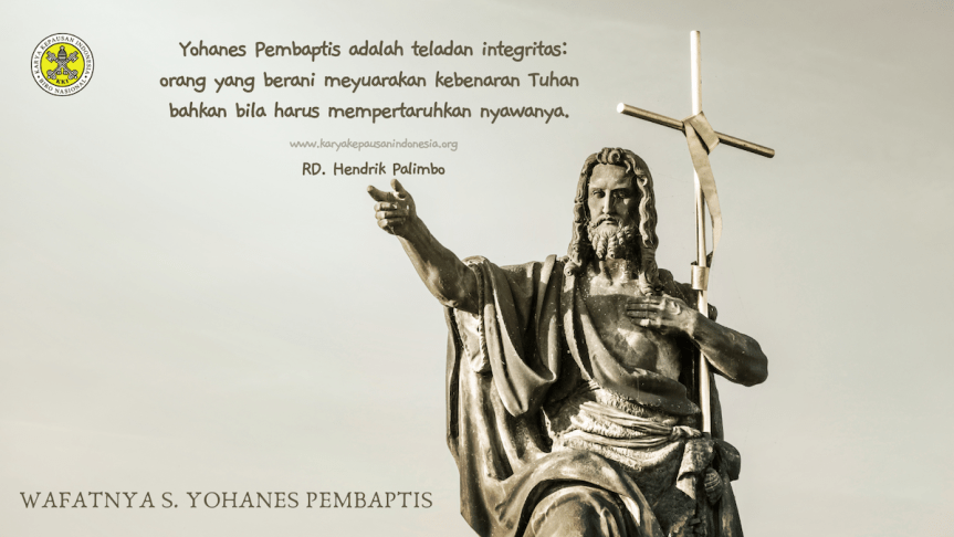 Saudara-saudariku yang terkasih dalam Kristus Yesus. Sifat Herodes ini yang tidak memiliki integritas menjadi peringatan kepada kita: terkadang kita tahu apa yang baik dan apa yang jahat, tetapi kita lebih memilih apa yang jahat di mata Tuhan. Yohanes Pembaptis adalah kebalikan dari Herodes Antipas ini. Yohanes memiliki integritas yang sangat tinggi. Boleh dikata, dia menjadi teladan tentang orang yang memiliki prinsip dan integritas, orang yang berani meyuarakan kebenaran Tuhan bahkan bila harus mempertaruhkan nyawanya.