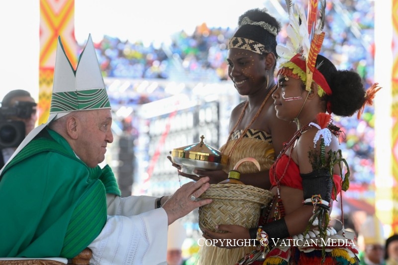 Hari ini, Tuhan juga berkata kepada anda sekalian, “Beranilah, rakyat Papua Nugini, janganlah takut! Bukalah dirimu! Bukalah dirimu terhadap sukacita Injil; bukalah dirimu untuk berjumpa dengan Allah; bukalah dirimu terhadap kasih saudara-saudarimu”. Semoga tidak seorang pun dari kita yang tetap tuli atau gagap terhadap undangan ini. Selain itu, semoga Beato John Mazzuccini menemanimu dalam perjalanan ini, karena di tengah banyak kesulitan dan permusuhan, ia membawa Kristus ke tengah-tengahmu, sehingga tidak seorang pun akan tetap tuli terhadap pesan keselamatan yang penuh sukacita, dan agar semua orang dapat melonggarkan lidah mereka untuk menyanyikan kasih Allah. Semoga hal ini benar-benar terjadi pada anda semua hari ini!